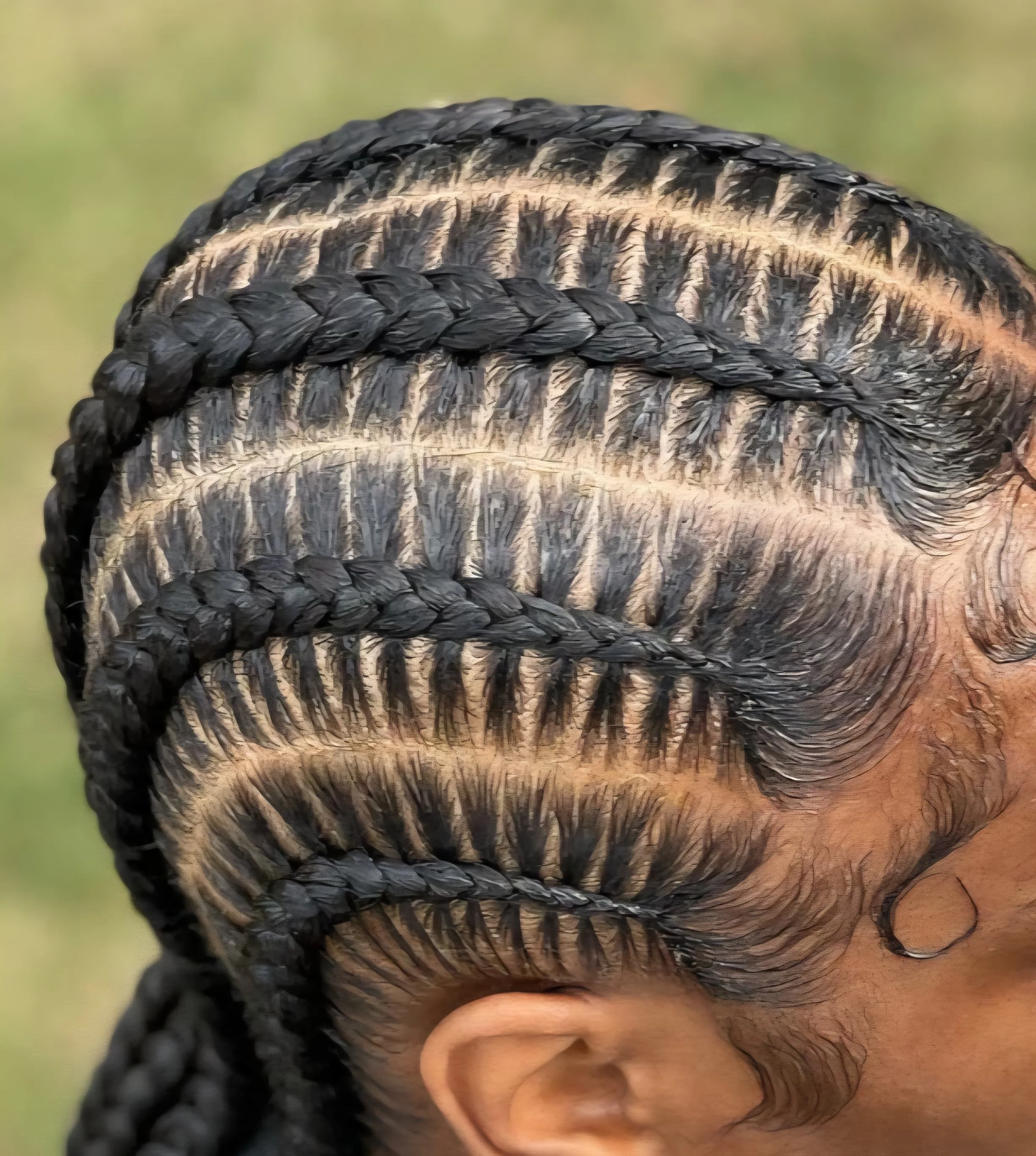 A sleek, modern version of cornrows that are defined by clean, straight “stitch-like” partings between each braid. The name comes from the way the hair is sectioned into neat, evenly spaced horizontal lines that resemble stitches.